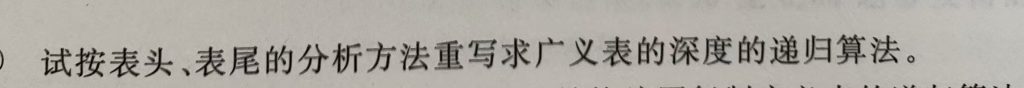 对于题目所要求的算法Get_List_Deepth来说,首先判断当前广义表是否为空表,若为空表,则记其深度为1;其次判断当前广义表节点是否为原子,原子不计入深度。判断完特殊情况后,开始对传入节点进行循环,在每一轮循环中,首先对其头子表进行递归,计算以其为起点的子表深度,然后更新当前深度的最大值,循环结束后转向当前表的尾子表,开始下一轮循环。此循环结束后就可以得到当前表的子表的深度,最后将其+1并返回即可。