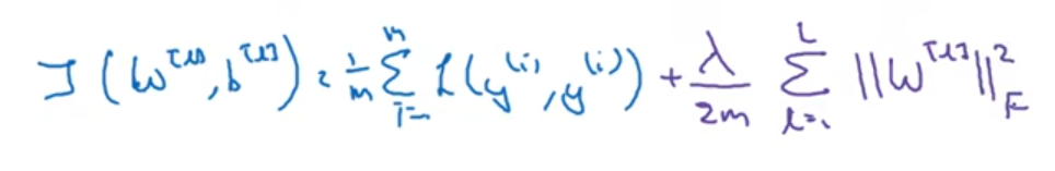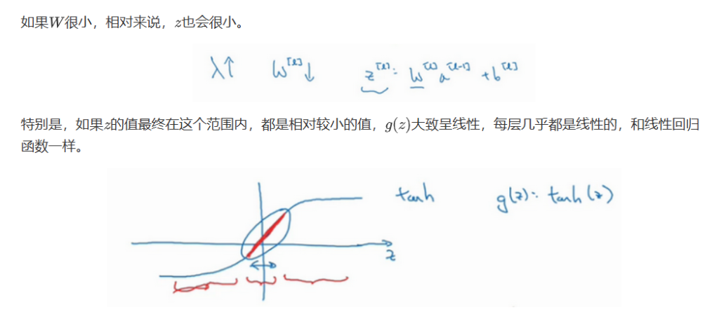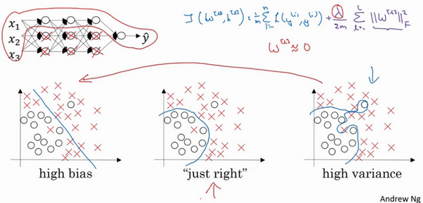 λ增加到足够大时,W会被压缩至很小,使得神经网络中的所有隐藏单元的影响变得极小,因此神经网络会变得更接近逻辑回归,更不容易发生过拟合