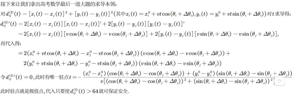 所以两机距离 [math] d_{ij}(t) = \sqrt {(x_i – x_j)^2 + (y_i – y_j)^2}[/math],为了计算方便,将其平方后再令 [math] d_{ij}^{(2)}(t) = [x_i (t) – x_j (t)]^2 + [y_i (t) – y_j (t)]^2 [/math],然后再求 [math]\min d_{ij}^{(2)}(t)[/math],转换为求一元函数极值问题 。