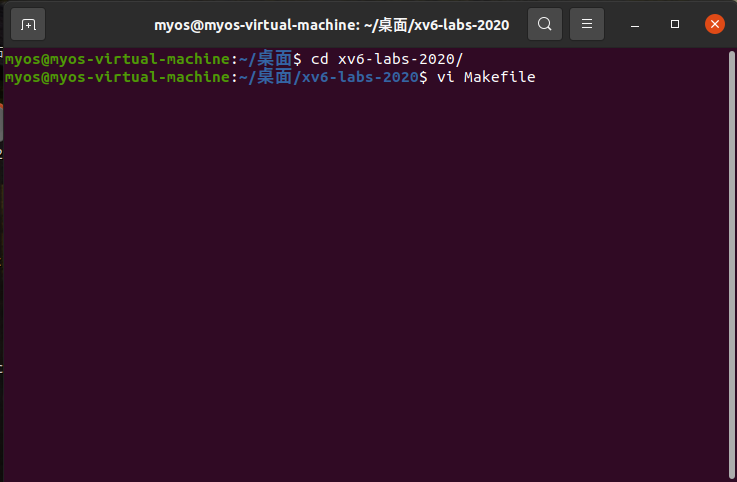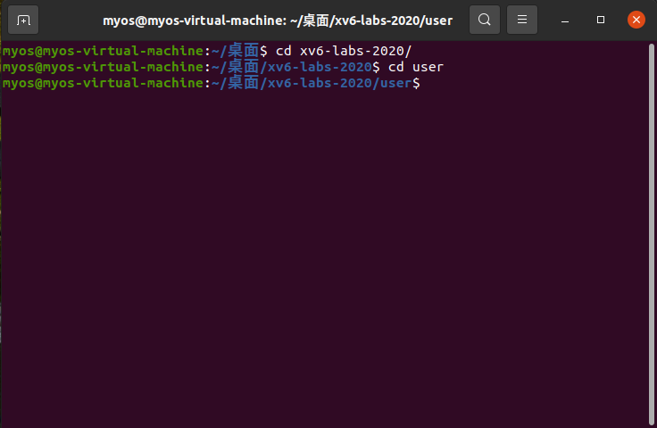 我们要找的目录是xv6-labs-2020/user,我们可以在终端中通过cd指令来切换到对应目录,如下图: