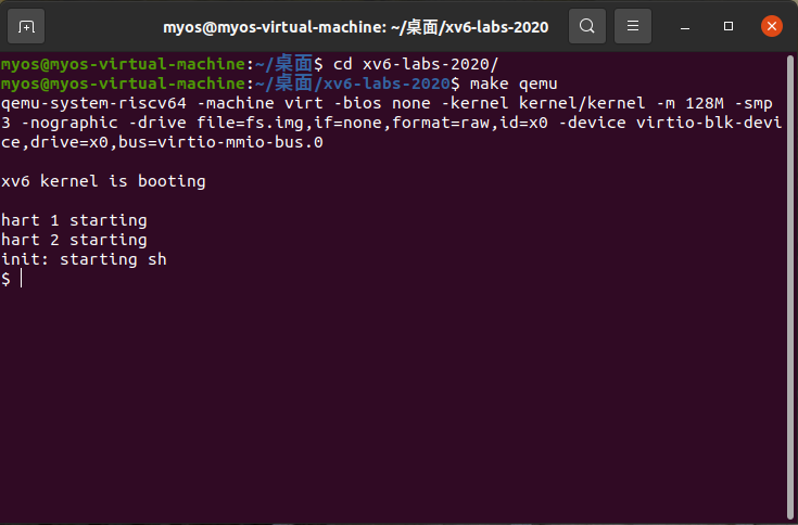 同样的,我们在xv6-labs-2020目录下输入:make qemu来启动xv6系统: