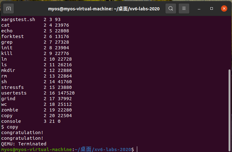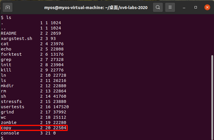 启动成功后,我们可以输入ls指令,来查看已编译的文件,此时我们就可以看到刚刚添加的copy: