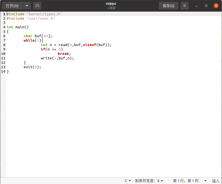 然后关闭终端,你会发现桌面上多了一份copy.c文件,你可以双击确认其中的内容是否和我们刚刚键入的相同,如果一致,那就说明我们创建成功了。